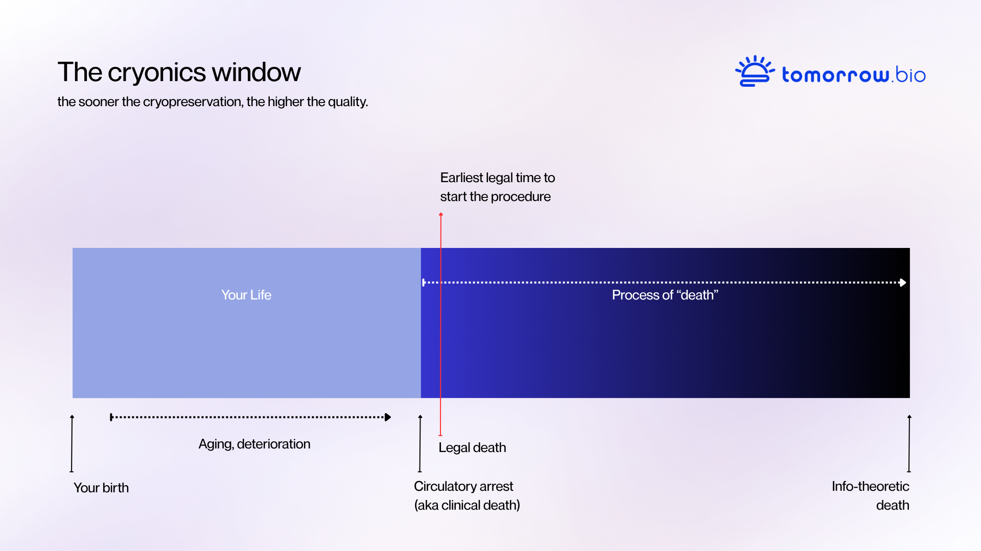 The graph above demonstrates these nuances further, and, combined with the quote, demonstrate the logic used by cryonicists to preserve the structure of the body - even though someone has already been declared dead.Clinical death, or the cessation of blood circulation and breathing, is the first step. It is potentially reversible by CPR. It is considered âthe first stepâ - at this point, no neurological or physiological decay is present, and the bodyâs cellular tissue is still in a state of general functionality. Then comes legal and biological death - the time after which the body may still have some biological functions, but has endured a (currently) irreversible cessation of either circulatory and respiratory functions or all functions of the entire brain. Note that even a century ago, what is now understood as reversible would have then had the same label. The patient is then declared âlegallyâ dead, and this is ideally the point at which SST Teams intervene to preserve the patient.